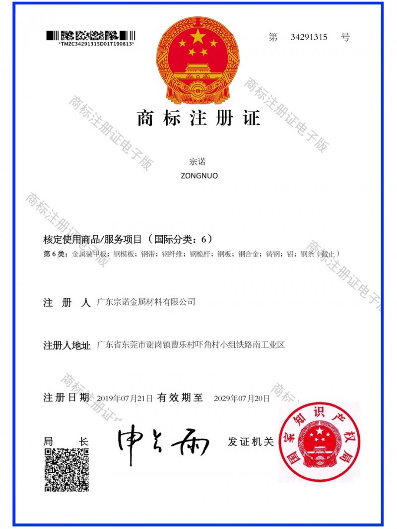 热烈祝贺我公司申请注册的"宗诺”商标,获得中华人民共和国国家工商行政管理总局商标局核准注册成功。商标是知识产权的重要组成部分,是企业的无形资产,凝聚着生产者、经营者的智慧和劳动,体现着企业的经营成果。我公司申请的“宗诺”商标的成功注册,不仅使该标志能够得到国家强制力的保护,而且对丰富企业品牌,维护企业名称,扩大企业影响,都将具有积极的意义,标致着宗诺在品牌建设方面取得了一个里程碑的胜利,我们会通过全体员工的不懈努力来维护厚洹产品的信誉,不断提高客户对我们品牌的认可度,从而使商标的价值不断提升,为客户提供优质的模具钢产品。